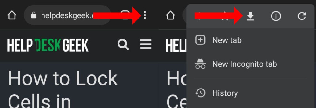 Voit avata minkä tahansa verkkosivun Chromessa Androidille ja lisätä sen lukuluetteloosi. Jos haluat tehdä tämän Chromessa, napauttamalla kolmipisteen kuvaketta sivun oikeassa yläkulmassa. Napauta nytalas nuoliKuvake, joka lataa sivun puhelimeesi.