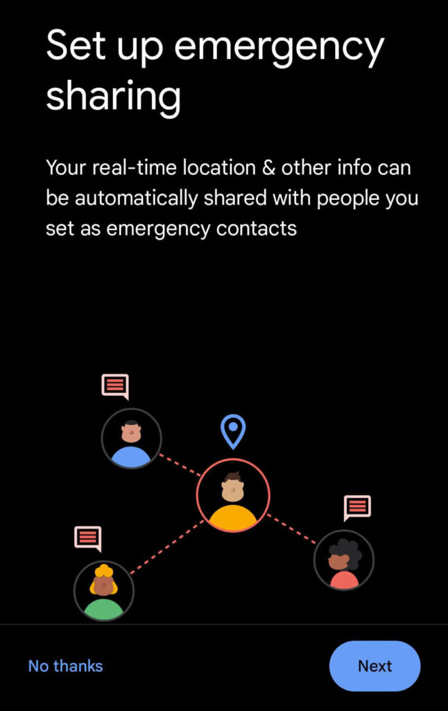 - Ensinnäkin voit asettaa hätätilanteen reaaliaikaisen sijainnin jakamisen. Tämä on suhteellisen uusi ominaisuus. ValitaSeuraavaHätäyhteyksien asettaminen taiEi kiitossiirtyä seuraavaan osaan.