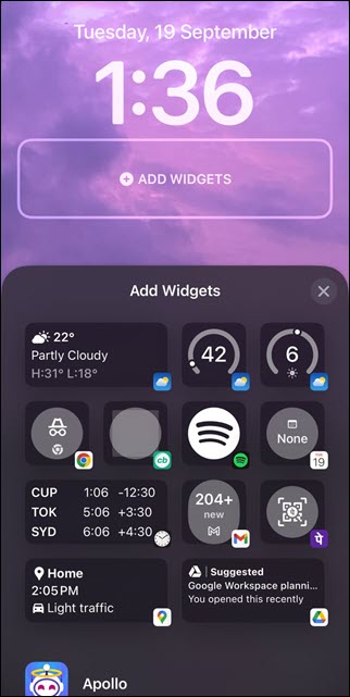 4.Napauta+Lisää widgetitVaihtoehto lukitusnäytössä.