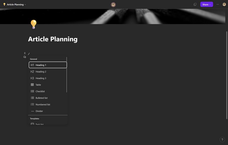 1.Kun olet luonut työtilan Loopissa ja aloitat asiakirjojen luomisen, voit kutsua komponenttiluettelon komennolla a/(eteenpäin) kauttaviiva komento. Kun olet syöttänyt sen, Loop avaa luettelon komponenteista, jotka voit lisätä nykyiseen asiakirjaan. Luettelo vaihtelee hymiöistä, otsikoista ja taulukoista tehtäväluetteloihin, edistymisen seurantaan ja äänestystaulukoihin.
