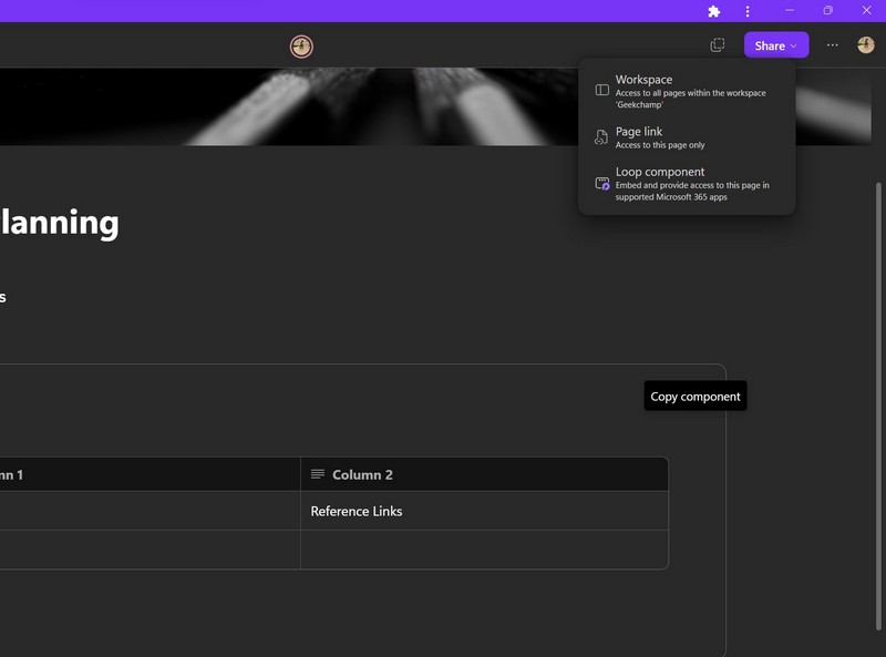 Silmukkakomponenttien luomisen lisäksi voit nyt myös luoda jaettavia linkkejä sivuille ja työtiloihin Loopissa. Nämä linkit voidaan jakaa työtovereiden ja käyttäjien kanssa, joilla on käyttöoikeus Loopiin, jotta he voivat käyttää jakamaasi sivua tai työtilaa.