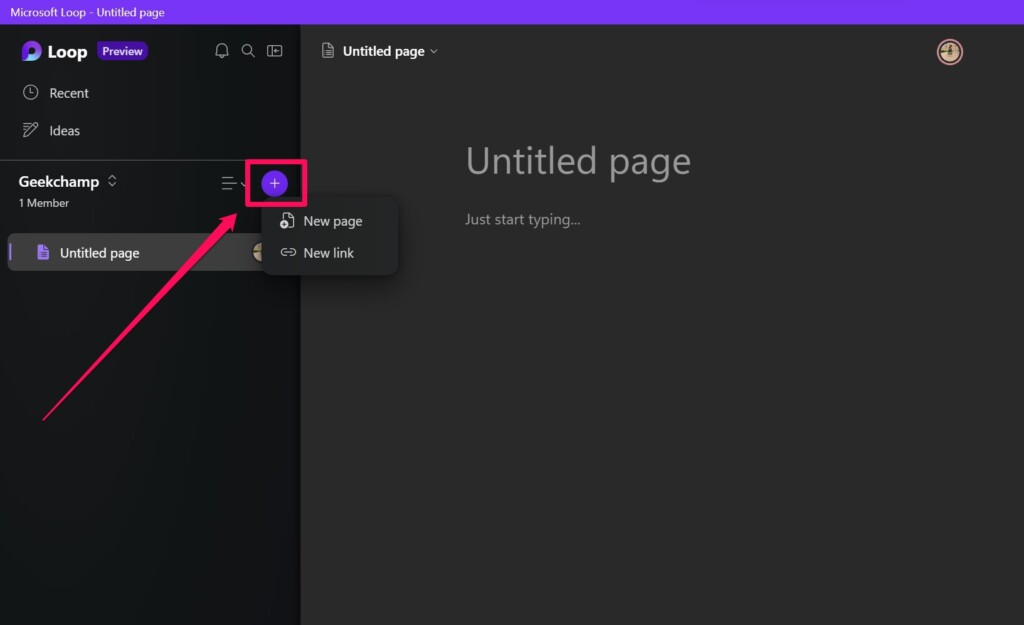 1.Uusi työtilasi sisältää tyhjän sivun ilman otsikkoa. Sen lisäksi, että lisäät Loop-komponentteja, kansikuvan ja emojin tyhjän sivun otsikkoon, voit napsauttaa+-painiketta sivunavigointipalkissa lisätäksesi sivuja työtilaan. Voit napsauttaaUusi sivumahdollisuus hankkia uusi tyhjä sivu tai käyttääUusi linkkivaihtoehto siirtää olemassa oleva Loop-sivu työtilaan käyttämällä sen jaettavaa linkkiä.