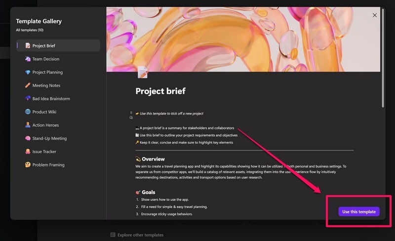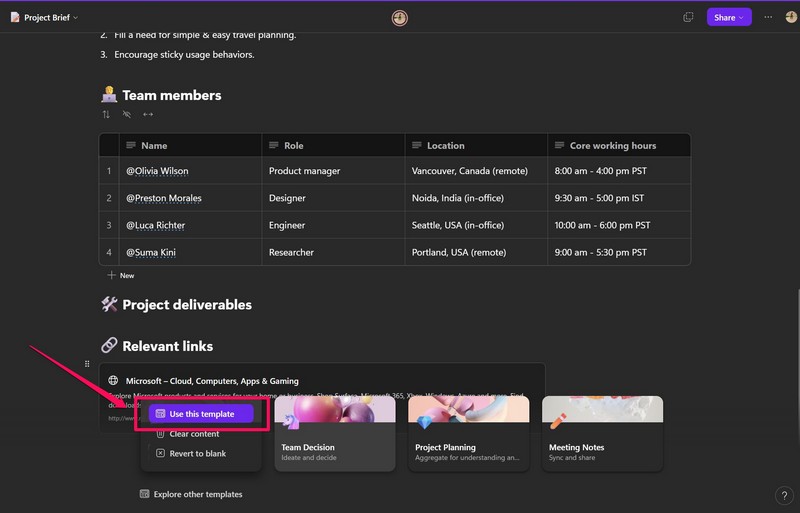 Nämä mallit ovat Microsoftin valmiiksi suunnittelemia, ja ne sisältävät satunnaisia tietoja, joita käyttäjät voivat mukauttaa tarpeidensa mukaan. Voit käyttää malleja Microsoft Loopissa noudattamalla alla olevia ohjeita:
