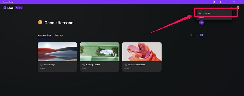 1.Microsoft Loopissanapsauta kaksipuolista nuolta-painiketta nykyisen työtilasi nimen vieressä päästäksesi kontekstivalikkoon.