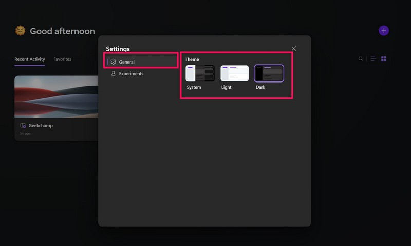 3.Nyt allaKenraali-välilehti, voit valitaKevytjaTummaTeemat Loop-sovellukselle. Voit myös valitaJärjestelmävaihtoehto antaa Loopin heijastaa Windows-järjestelmäsi teemaa.