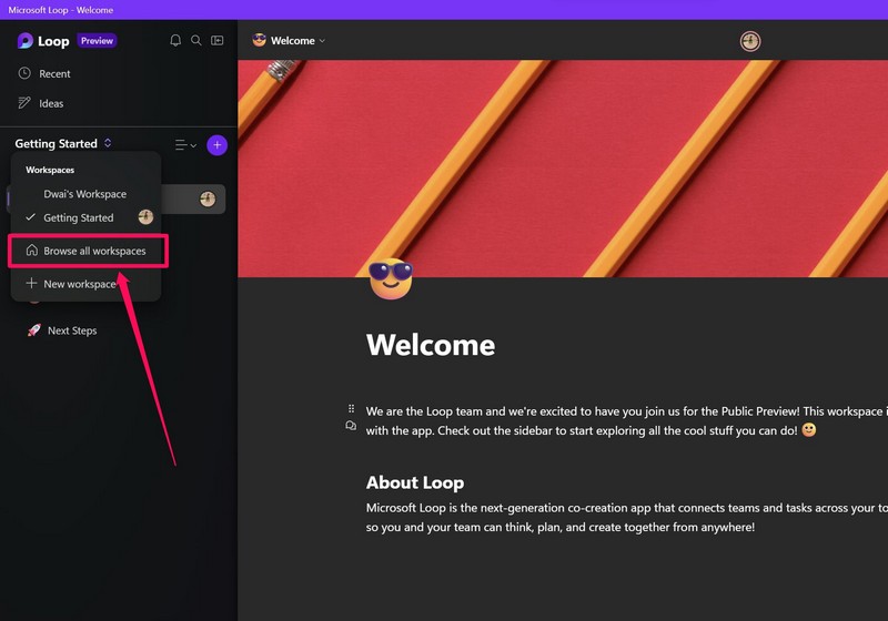 2.Tai,napsauta nykyisen työtilasi otsikkoaja osuiSelaa kaikkia työtilojavaihtoehto mennäKotisivuLoopissa.