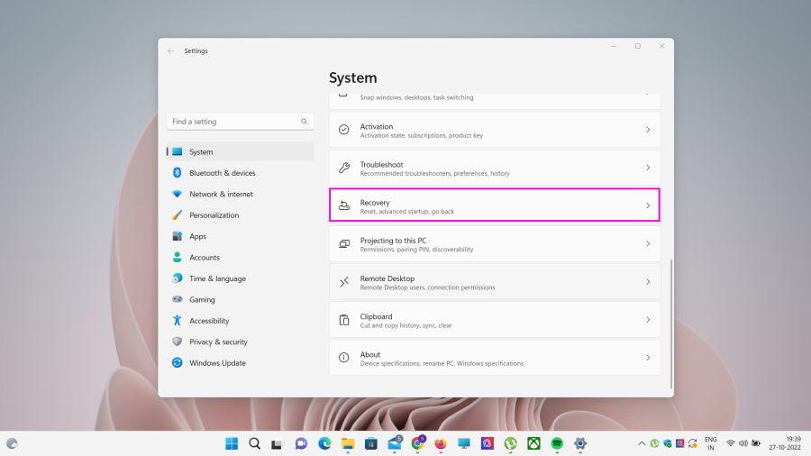 2.ValitseJärjestelmäja napsautaPalautusVälilehti sivun oikealla puolella.