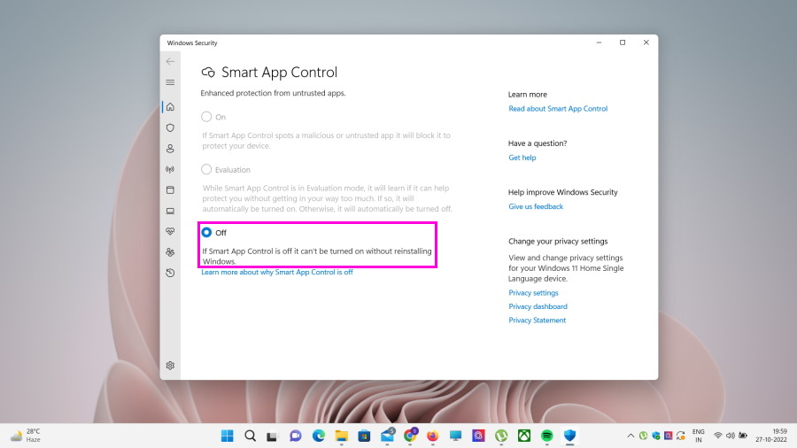 Muuten järjestelmän ei ole mahdollista kertoa, onko laitteessasi jo käytettävissä epäluotettava sovellus. Joten, sinun on asennettava Windows 11 uudelleen, ja sitten voit ottaa Smart App Controlin uudelleen käyttöön. Jos olet kunnossa kaikkien näiden kanssa ja haluat silti poistaa tämän tietoturvaominaisuuden käytöstä, siirry seuraaviin vaiheisiin.