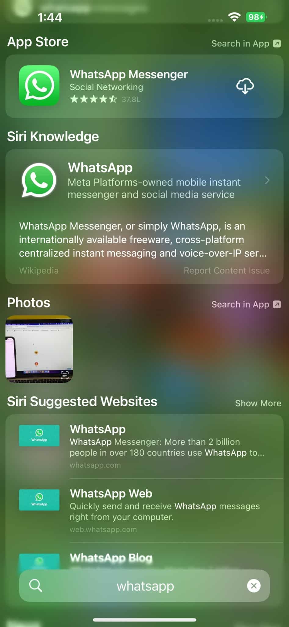 Nyt saat suoran vaihtoehdon ottaa yhteyttä ihmiseen muiden sovellusten kautta - kuten viestien lähettäminen WhatsAppiin. Spotlight -haku näyttää jopa henkilön valokuvat iPhonessa.