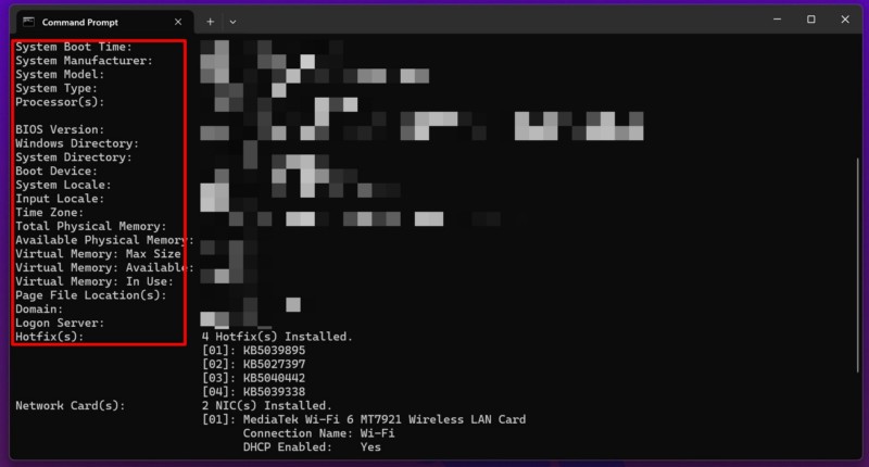 Joten käy läpi komentokehotusikkunan järjestelmätieto -sivut saadaksesi kuvan Windows 11 -tietokoneen tai kannettavan tietokoneen kokonaistoimintahistoriasta.