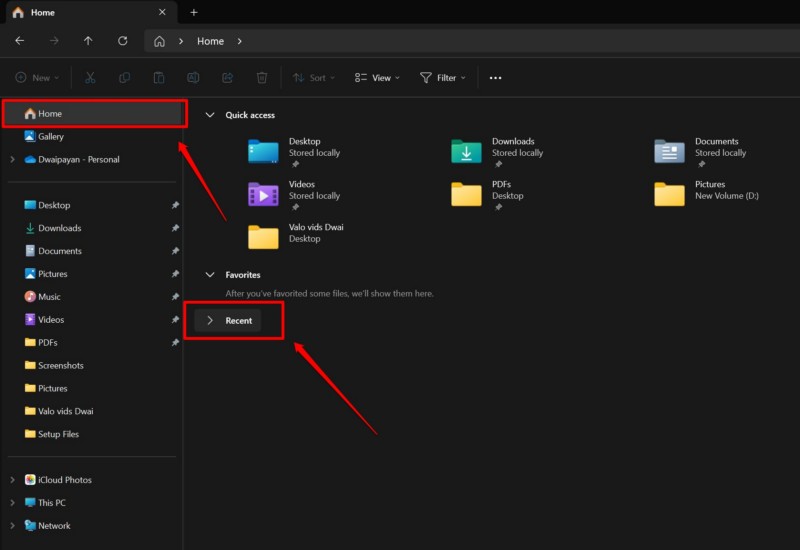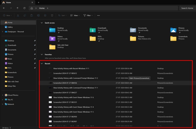 Toinen yksinkertainen tapa tarkastella Windows 11 -tietokoneen tai kannettavan tietokoneen toimintahistoriaa on File Explorerin viimeaikaisen osan tai kansio. Windows 11: n tiedostotutkija seuraa kaikkia viimeaikaisia tiedostoja ja niiden tallennuspaikkoja.