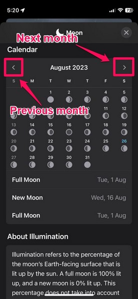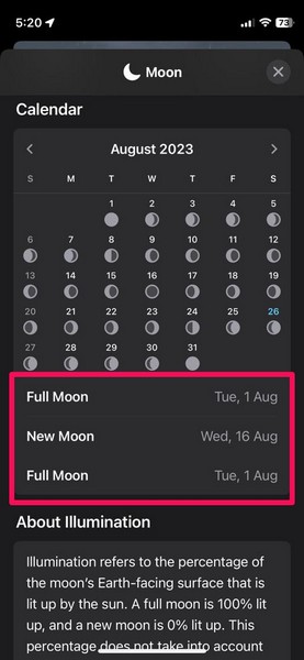 5.Voit myös tarkistaa päivämäärätTäysikuujaUusi kuuValittu kuukausi heti kalenterinäkymän alapuolella.