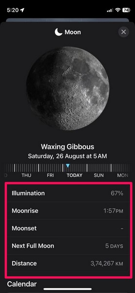 3.Tässä yleiskatsauslaatikossa tuletEtsi joitain reaaliaikaisia tietoja kuustakuten sen valaistus, sen kasvava aika ja sen asetusaika nykyiseen päivämäärään.