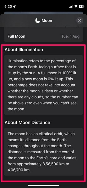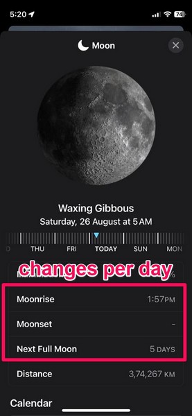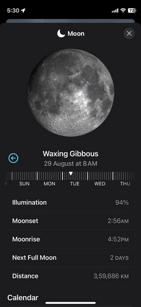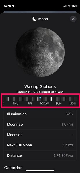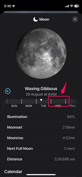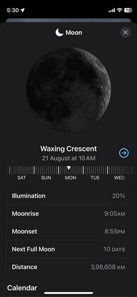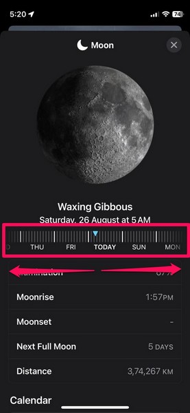 Täältä tulee interaktiivinen, vaakasuora vierityspalkki, ja voit seurata alla olevia vaiheita tarkistaaksesi kuuhuoneen, Moonrise- ja Moonset -aikojen tiettyjen päivämäärien ja aikojen iPhonessa iOS 17: ssä: