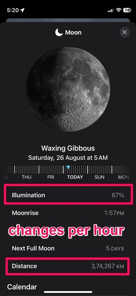 4. liu'uttamalla se oikealleNäyttää kuun vaihe, valaistusnopeus, Moonrise -aika, kuusikausi ja kuun etäisyysAiemmat päivämäärät ja ajanjaksot.