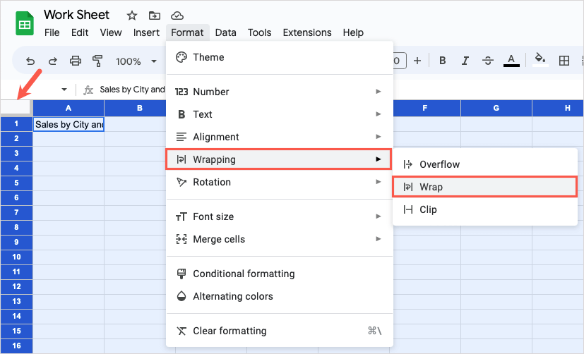 Aseta kaikki solut käärittämään kirjoittamasi tekstin, käytäValitse kaikkiPainike (neliö sarakkeen A ja rivin 1 välillä) Valitse koko arkki.