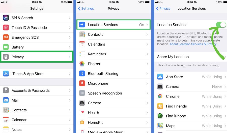 Toinen seikka, joka sinun tulee ottaa huomioon, on se, että geopaikannusjärjestelmä kuluttaa aina akkua. Mikä tahansa älypuhelin tyhjenee, kun sen on käytettävä GPS:ää saadakseen maantieteellisen sijaintinsa. iOS:ssä on vaihtoehto, jonka avulla tietyt sovellukset voivat käyttää GPS:ää milloin tahansa ja joka voi kuluttaa paljon energiaa. Jos haluat hallita, mitkä sovellukset voivat tehdä tämän, sinun on noudatettava näitä ohjeita: