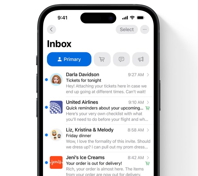 Mail -sovellus tukee automaattista saapuvaa sähköpostiluokitusta, joka järjestää viestisi eri luokkiin, kuten ensisijaiset, tapahtumat, päivitykset ja tarjoukset. Viestien järjestäminen tapahtuu laitteessa.