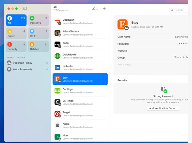 Voit käyttää sitä myös passkeys-, Wi-Fi-salasanojen, varmennuskoodien tallentamiseen. Apple sanoo, että salasanojen sovellus hälyttää käyttäjiä, kun se havaitsee heikkoja salasanoja, uudelleen käytettyjä salasanoja ja datavuodoista löydettyjä.