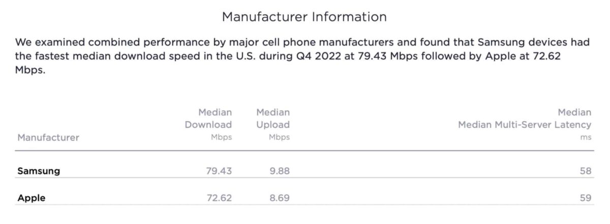 Muut testitulokset osoittavat, että Samsung -älypuhelimet ottavat yleisen lyijyn "nopeimmista mediaanin latausnopeuksista kaikkiin iPhoneihin noin 7 Mbit / s".