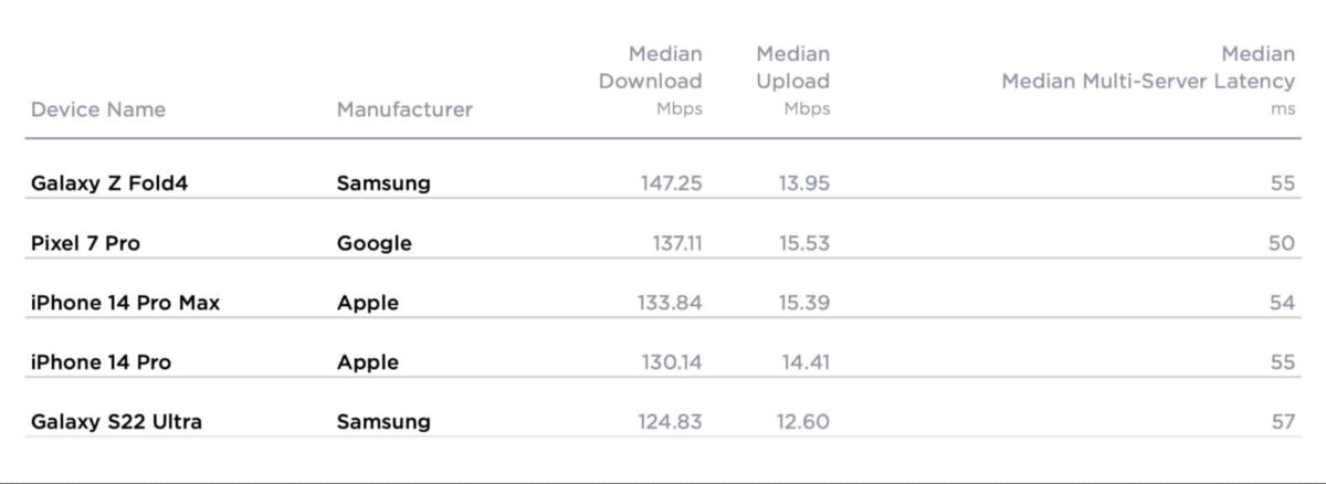 Viimeisen vuosineljänneksen 2022 viidestä nopeimmasta 5G -laitteesta Samsung Galaxy Z Fold4: n huipulle sijoittui Googlen Pixel 7 Pro sijoittui toiseksi, iPhone 14 Pro Max sijoittui kolmanneksi, iPhone 14 Pro sijoittui neljänneksi ja Samsung Galaxy S22 Ultra sijoittui viidenneksi.