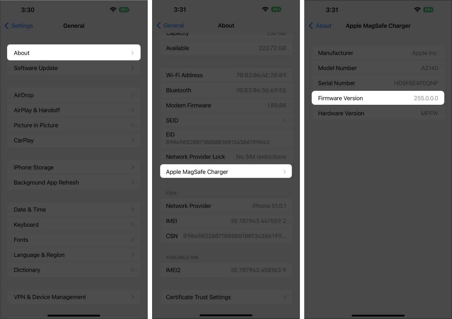Vaikka laiteohjelmistopäivitystä ei ole varmaa tapaa, voit selvittää, mitä laiteohjelmistoversiota ja mallinumeroa Magsafe -laturilla on. Mutta ennen jatkamista,Varmista, että MagSafe -laturi on kiinnitetty iPhoneen ja kytketty virtalähteeseen.