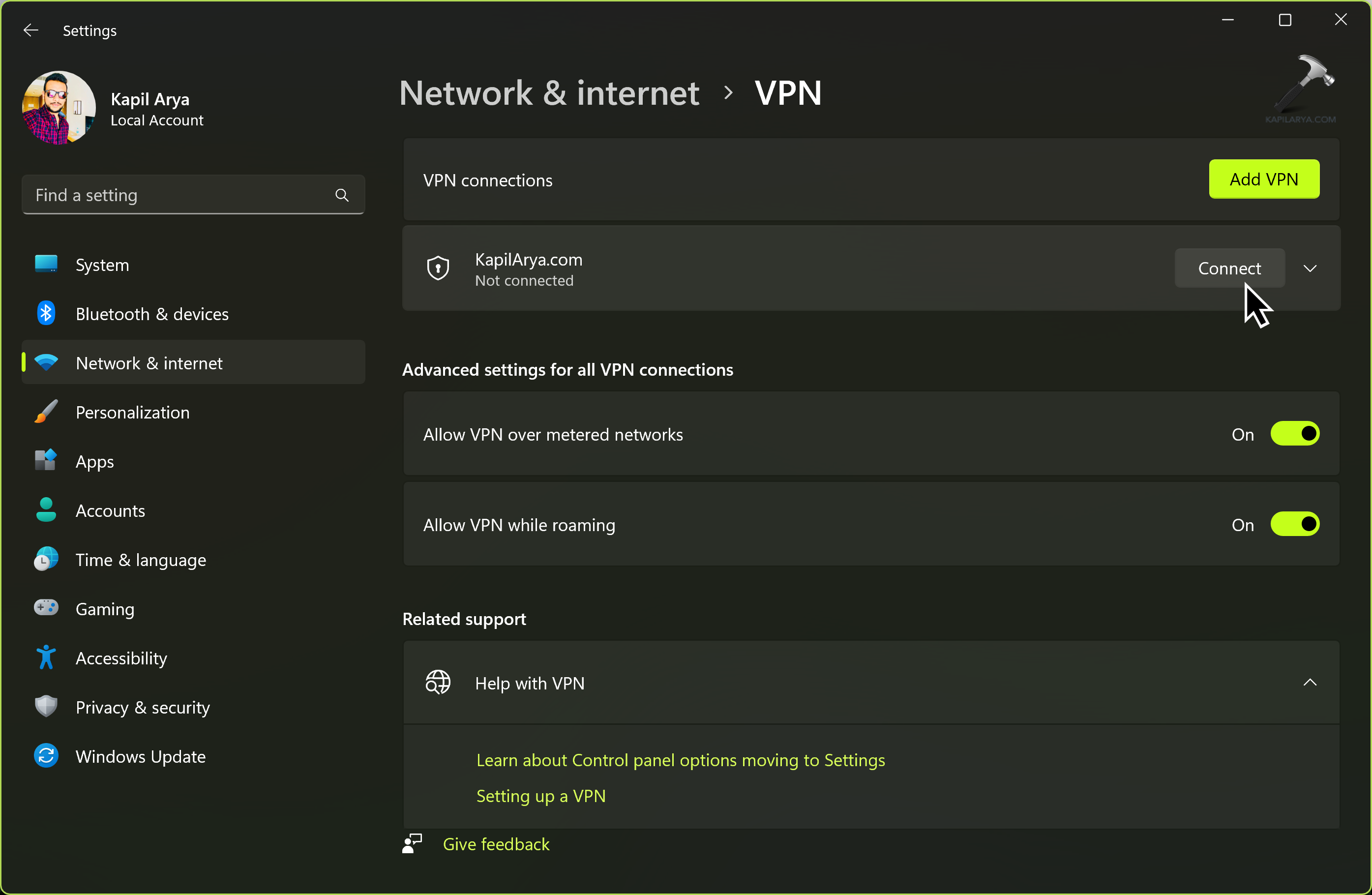 VPN-palvelimen yhdistämisen vaiheet Windows 11:ssä
