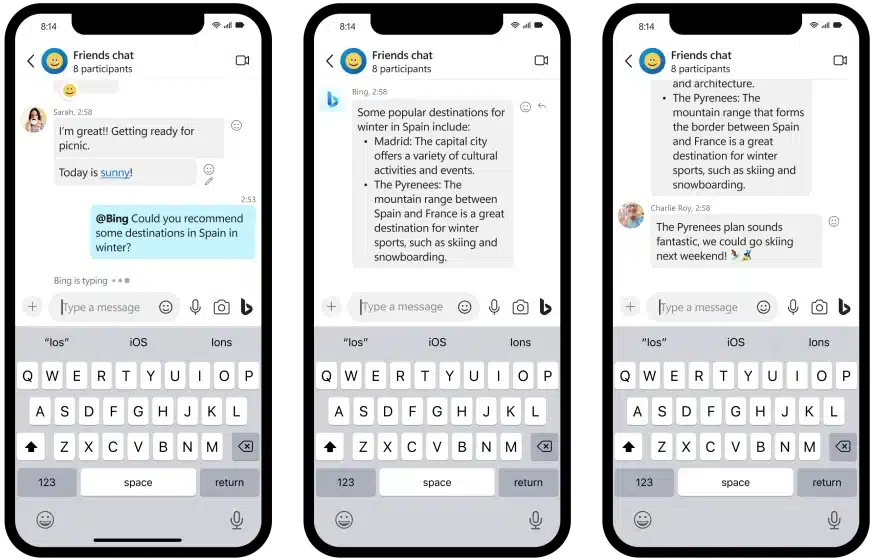 - Skypessä käyttäjät voivatkeskustella chatbotin kanssayksi kerrallaan tai lisää se ryhmäkeskusteluun. Mukaan lukien ominaisuudet, kuten chatbotin pyytäminen auttamaan matkan suunnittelua ja antamaan kaikkien muiden nähdä ehdotuksia samanaikaisesti, asettamalla keskustelu pyytämällä sitä selventämään, mitä elokuvia näyttelijä on ilmestynyt viimeisen vuosikymmenen aikana, ja kääntämällä tietoja myös yli 100 kielen välillä.