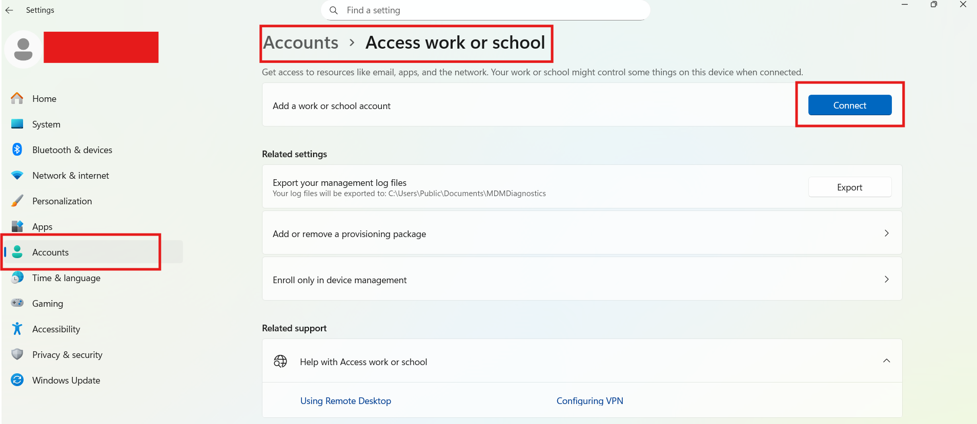 %localappdata%PackagesMicrosoft.AAD.BrokerPlugin_cw5n1h2txyewy. - Avaa Asetukset, siirry kohtaan Tilit ja sitten Käytä työpaikkaa tai koulua. Katkaise yhteys ja lisää tilisi uudelleen napsauttamalla Yhdistä.