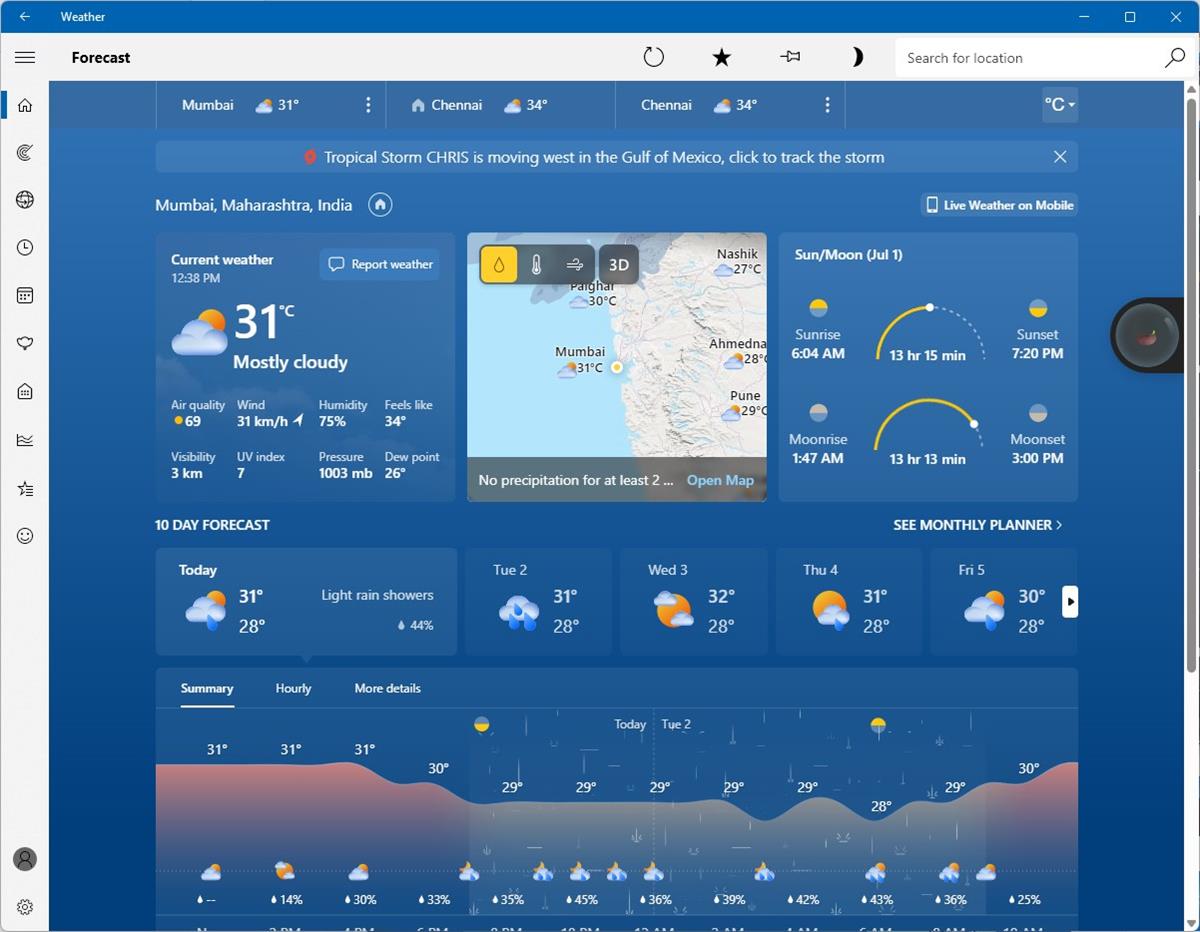 Sivuhuomautuksessa sääsovelluksessa on nyt sujuva muotoilu, jossa on hämärtyviä ja läpinäkyvyystehosteita, jotka näkyvät valikossa, pääsivulla ja laatoilla. Sivupalkissa on joitain uusia vaihtoehtoja, voit nyt vaihtaa päivittäisen, viikoittaisen, kuukausittaisen ennusteen, karttojen ja muiden tietojen välillä.