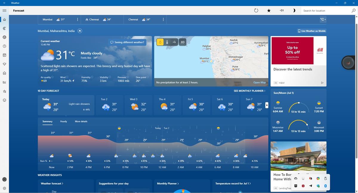 Se on sääli, koska säätiedot ovat todella melko hyviä. Mutta tässä on hyvä uutinen, s s. Seen vain maksimoitua tilaa, joten sinun tarvitsee vain käyttää sovellusta pienemmässä ikkunassa. Huono uutinen on, että tämä temppu toimii vain pääsivulla, ts. Sääsovelluksen ennuste -välilehdellä, joten mainokset näkyvät edelleen kaikilla muilla sivuilla.