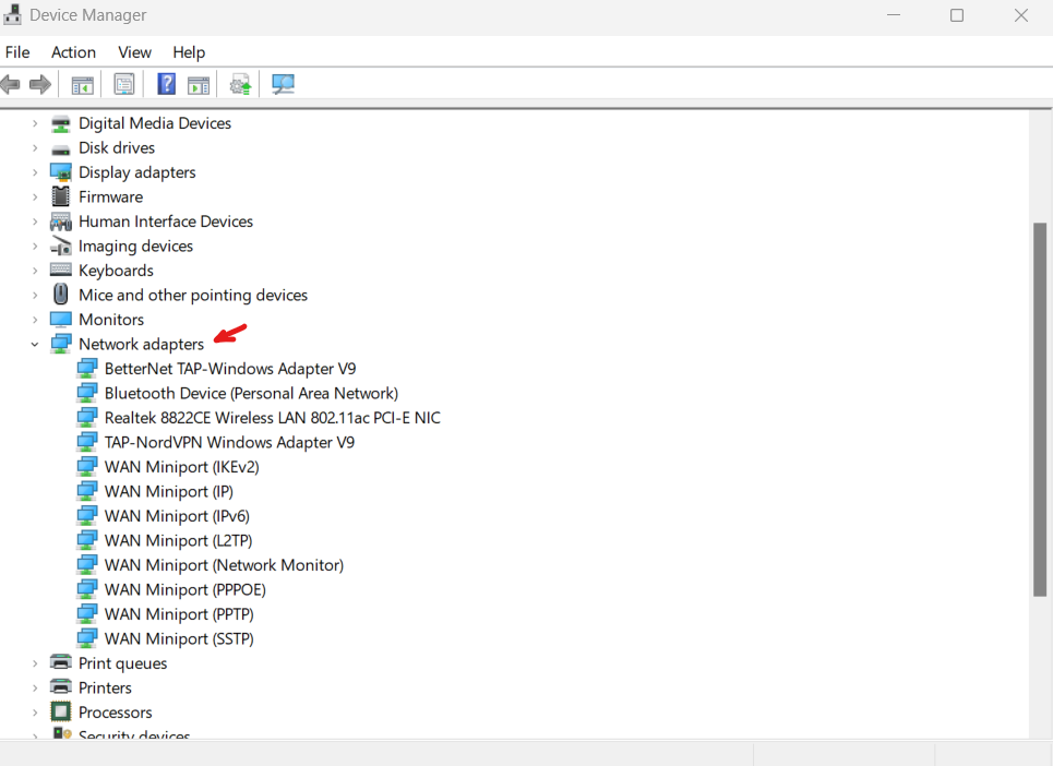 NapsauttaaVerkkosovittimetKontekstivalikosta luokan laajentamiseksi. Saat luettelon kaikista tietokoneellesi asennetuista verkkoohjaimista.