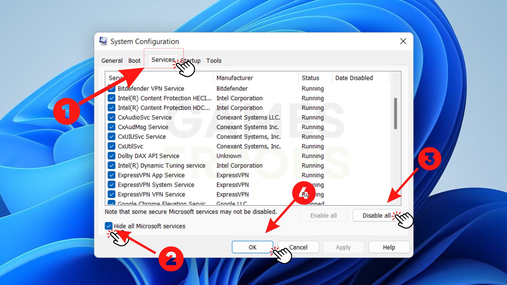 - Siirry järjestelmän kokoonpano -ikkunassa ”Palvelut”Tab.