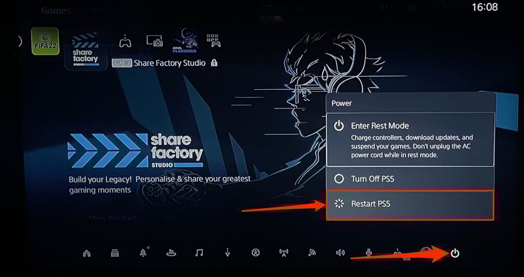 PainaPS -painikeValitse DualSense-ohjaimesta virtakuvake oikeassa alakulmassa ja valitseKäynnistä PS5 uudelleen.