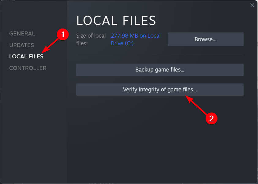 - MennäPaikalliset tiedostotTAB ja napsautaVarmista pelitiedostojen eheyspainike.