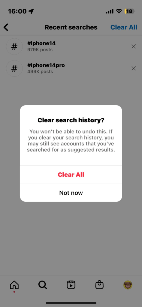 Selvitä täydellinen hakuhistoriasi siirtymällä Instagram -asetuksiin ja vieritä alas ”suojaus” -osaan. Sieltä napauta ”selkeä hakuhistoria”. Instagram pyytää sitten vahvistusta ennen koko hakuhistorian poistamista.