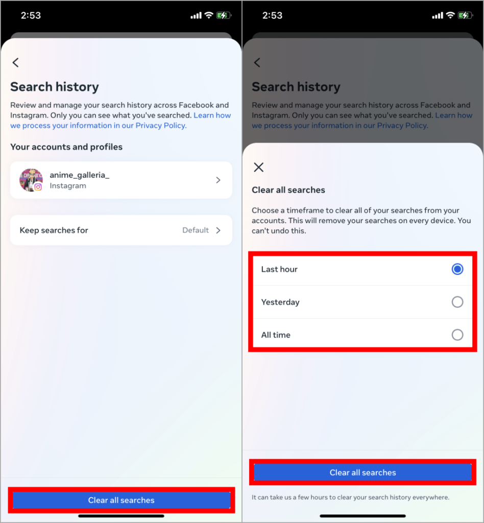 Täältä tulee toinen yksinkertainen menetelmä Instagram -hakuhistorian tyhjentämiseksi. Joten, haluatko poistaa hakuhistorian Instagramissa, mutta vain tietylle aikataululle? No, sinulla on onnea! Instagram antaa sinun poistaa hakuhistorian tietystä aikataulusta, mikä antaa sinulle entistä enemmän hallinnan henkilökohtaisen kokemuksenne.