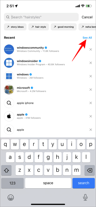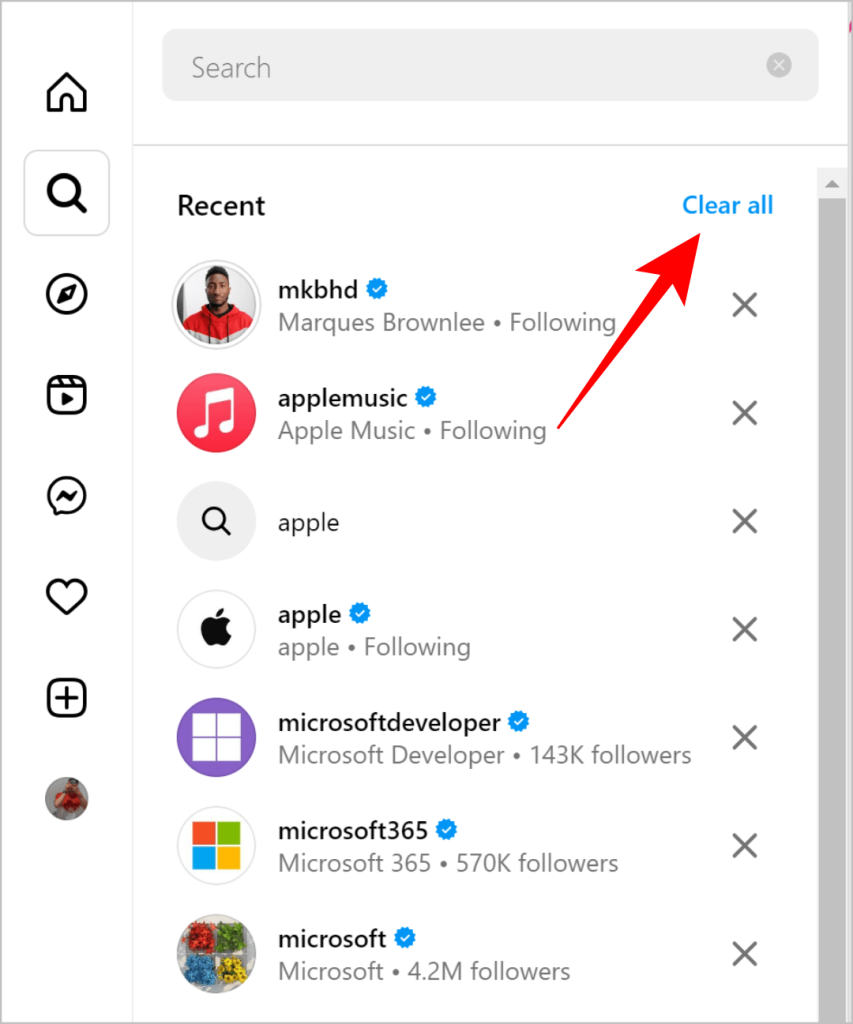 Jos haluat poistaa tietyn haun, siirry vain Instagram -hakupalkkiin ja napsauta suurennuslasikuvaketta. Tämä tuo esiin viimeaikaiset haut. Sieltä voit valita poistettavan haut napsauttamalla jokaisen haun vieressä olevaa ”X”.