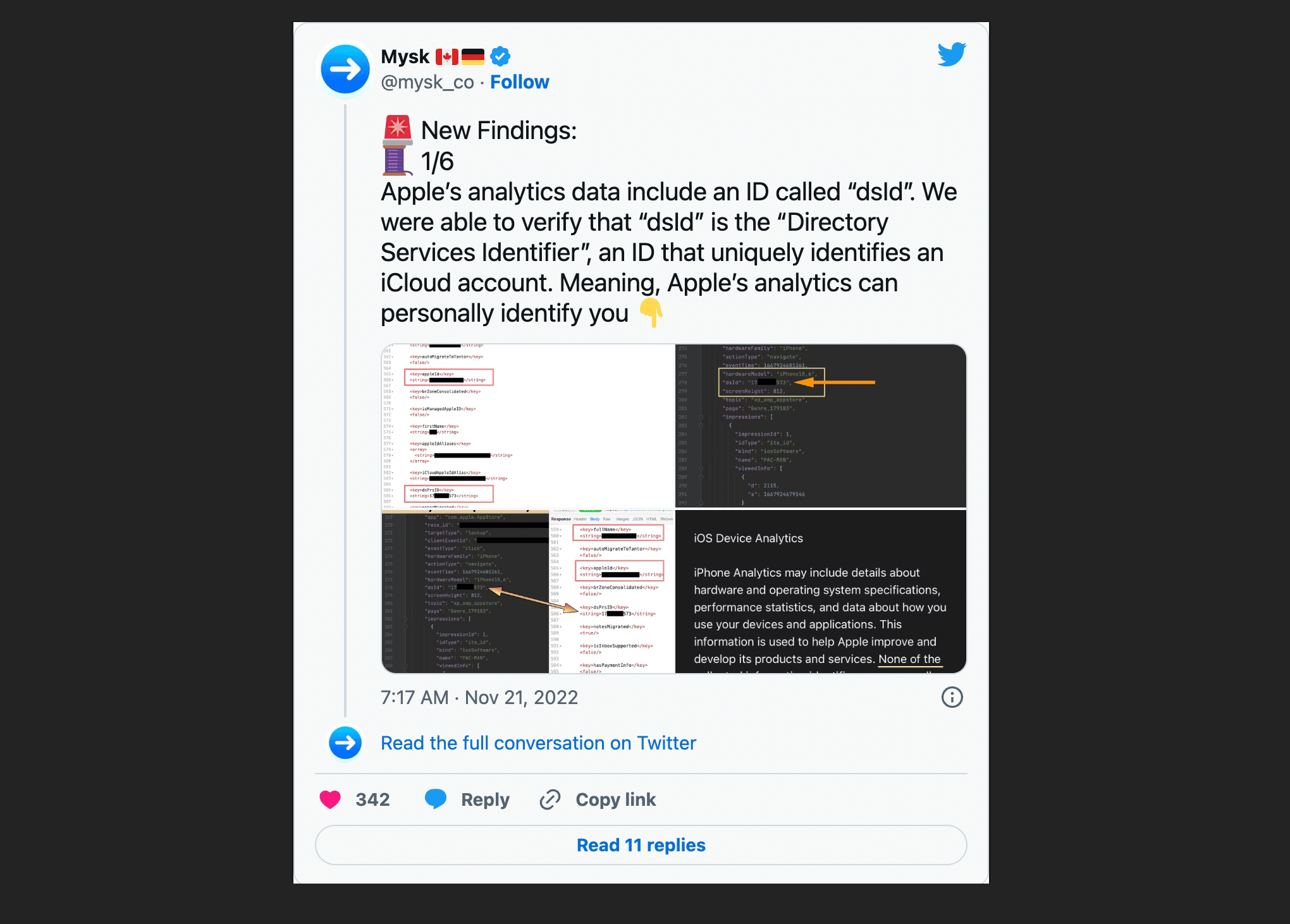 Myskin kyberturvallisuustutkijat ovat havainneet, että Apple Device Analytics ja Privacy sisältävät käyttäjien henkilökohtaisesti tunnistettavia tietoja, kuten heidän nimensä, sähköpostinsa ja muut yksityiskohdat, jotka linkittävät suoraan tiettyyn käyttäjään.