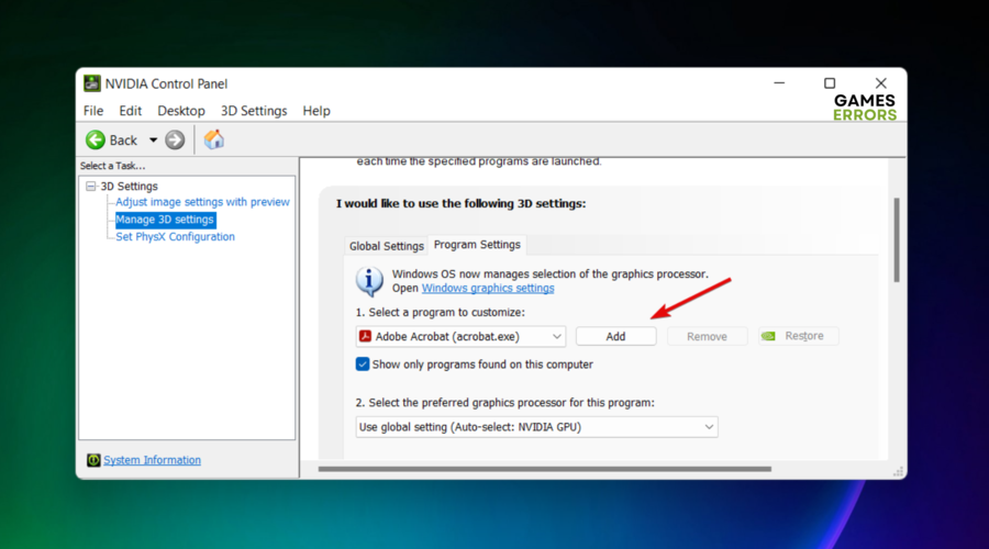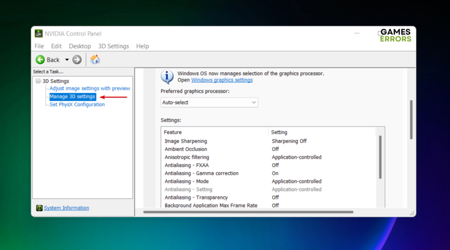 2. Katso vasenta ikkunaruutua ja valitse sittenHallitse 3D-asetuksialinkki.