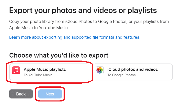 - Valitse vaihtoehto siirtää tietosi, keskittymällä erityisesti musiikkisoittolistoihisi. Varmista, että sinulla on aktiivinen Apple Music- tai iTunes -ottelutilaus sekä YouTube -musiikkitili.