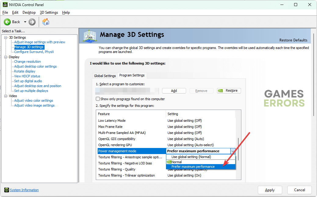 - Mennä jhkHallitse 3D -asetuksiaja napsautaOhjelma -asetukset.