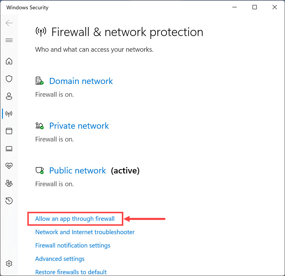 2. Napsauta palomuuri- ja verkkosuojaus> Salli sovellus palomuurin kautta.