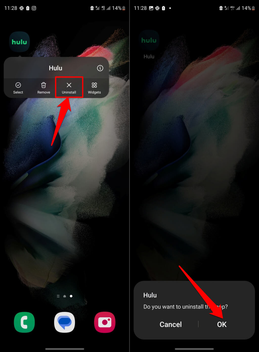 Paina pitkään Hulu-sovellusta Android-laitteellasi ja valitsePoista asennuspoistaaksesi sovelluksen ja napauttamallaOK.