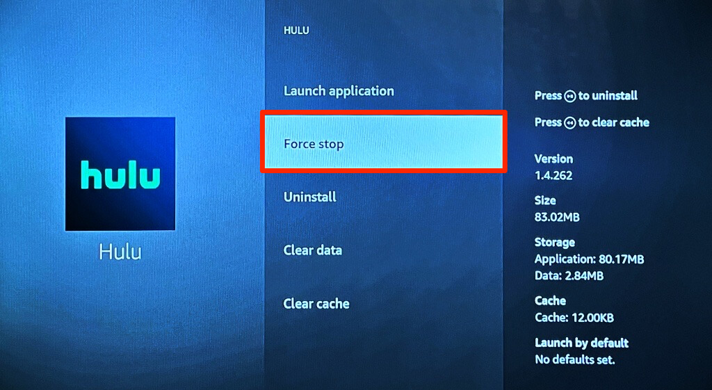 Jos haluat pakottaa Hulen sulkemaan Fire TV -laitteen, siirry kohtaanAsetukset>Sovellukset>Hallitse asennettuja sovelluksia>Huluja valitsePakota pysäytys.