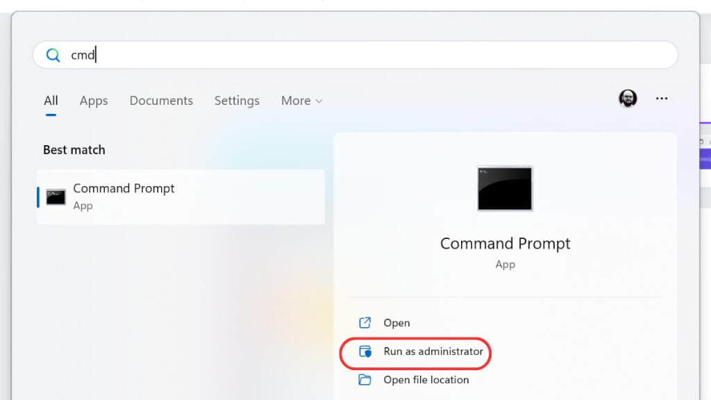 Jos haluat tehdä tämän, avaa komentokehote kirjoittamalla “CMD” hakupalkkiin. Sen jälkeen sinun pitäisi napsauttaa hiiren kakkospainikkeellaKomentokehotusValitseSuorita järjestelmänvalvojana,Tai valitse Sama sovelluksen tietoruudusta käynnistysvalikosta.