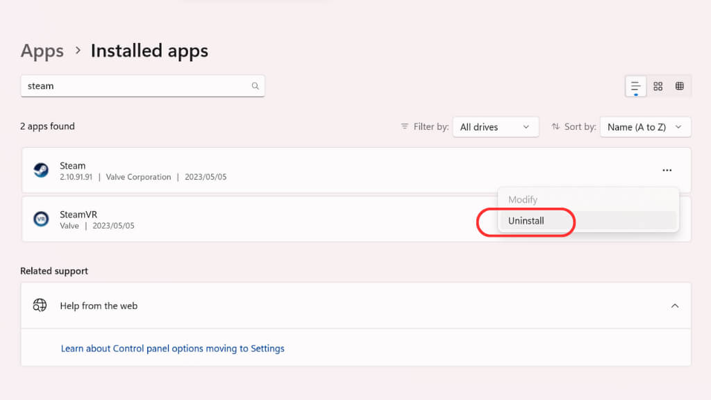 Jos haluat poistaa höyryn, etsi “Lisää tai poista ohjelmia”Käynnistysvalikkoja sittenValitse se. Etsi sitten höyryä ja poista se oikeanpuoleisen avattavasta valikon kautta.