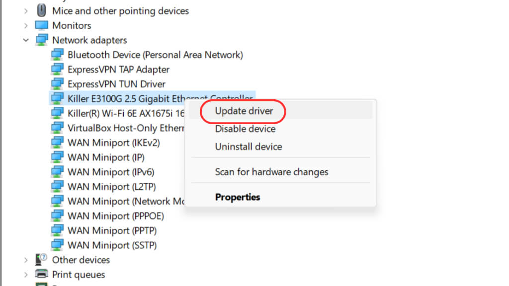 - LaajentaaVerkkosovittimetosio Device Manager -ikkunassa, napsauta hiiren kakkospainikkeellaverkon laiteja valitsePäivitä ohjain.