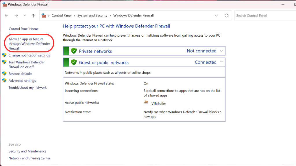 - Vasemmalla puolella näet luettelon vaihtoehdoista; valitaSalli sovelluksen tai ominaisuuden Windows Defender -palomuurin kautta.