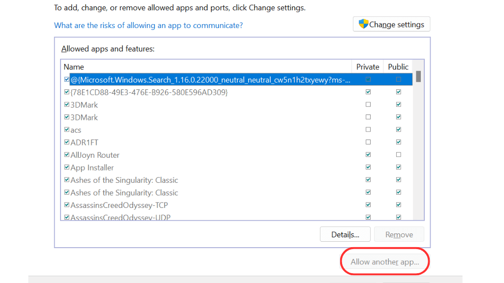 - Etsi höyryä sallittujen sovellusten ja ominaisuuksien luettelosta. Jos sitä ei ole siellä, napsautaVaihda asetukset-
